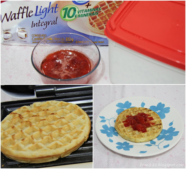 Voltando ao waffle, eu aqueci o waffle na sanduicheira até ele ficar torradinho, coloquei a geleia, uma bola de sorvete e depois mais um pouco de geleia.